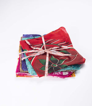 This pack of six sari wraps are handcrafted from upcycled Indian sari fabric. There are multiple stickytape-free ways to wrap with these 70cm squares and the upcycled nature of this product means no two squares are alike.
