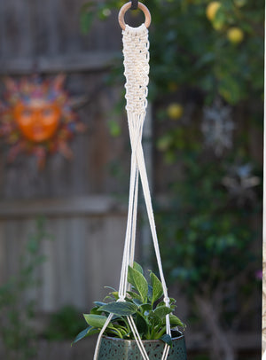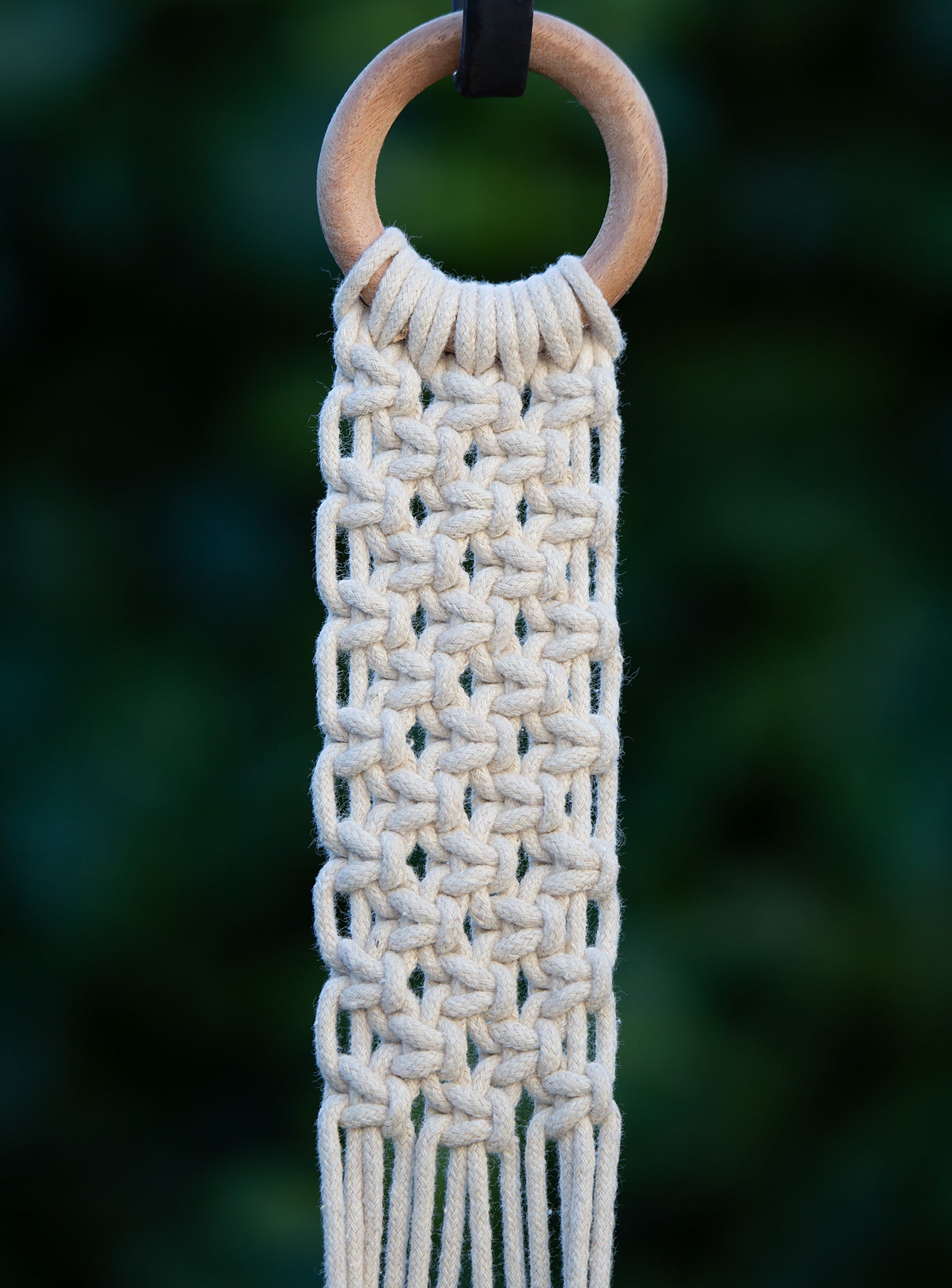 Suspended from a smooth wooden ring, the piece showcases expert knotting techniques in its upper section, transitioning into gracefully twisted strands that create visual movement.